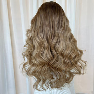 COLOUR: DARK BROWN ROOT STRETCH WITH DARK GOLDEN BLONDE MID LENGTHS AND LOWLIGHTS WITH CHAMPAGNE BLONDE ENDS