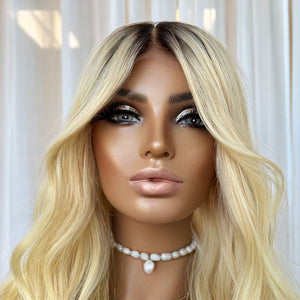 HER COLOUR: LIGHT BROWN ROOTS WITH BLONDE ALL OVER