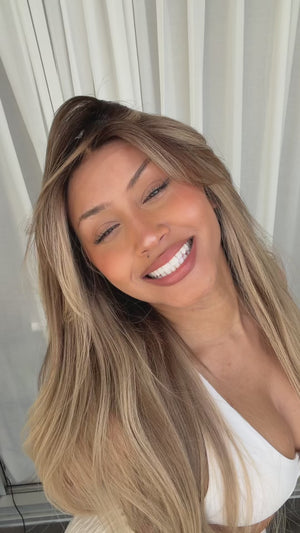 COLOUR: NATURAL BROWN ROOT FADING INTO SOFT GOLDEN BLONDE ENDS AND FACE FRAMING HIGHLIGHTS