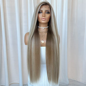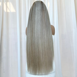 COLOUR: DARK PEARL BLONDE ROOTS WITH LOWLIGHTS ON A LIGHT PEARL BASE