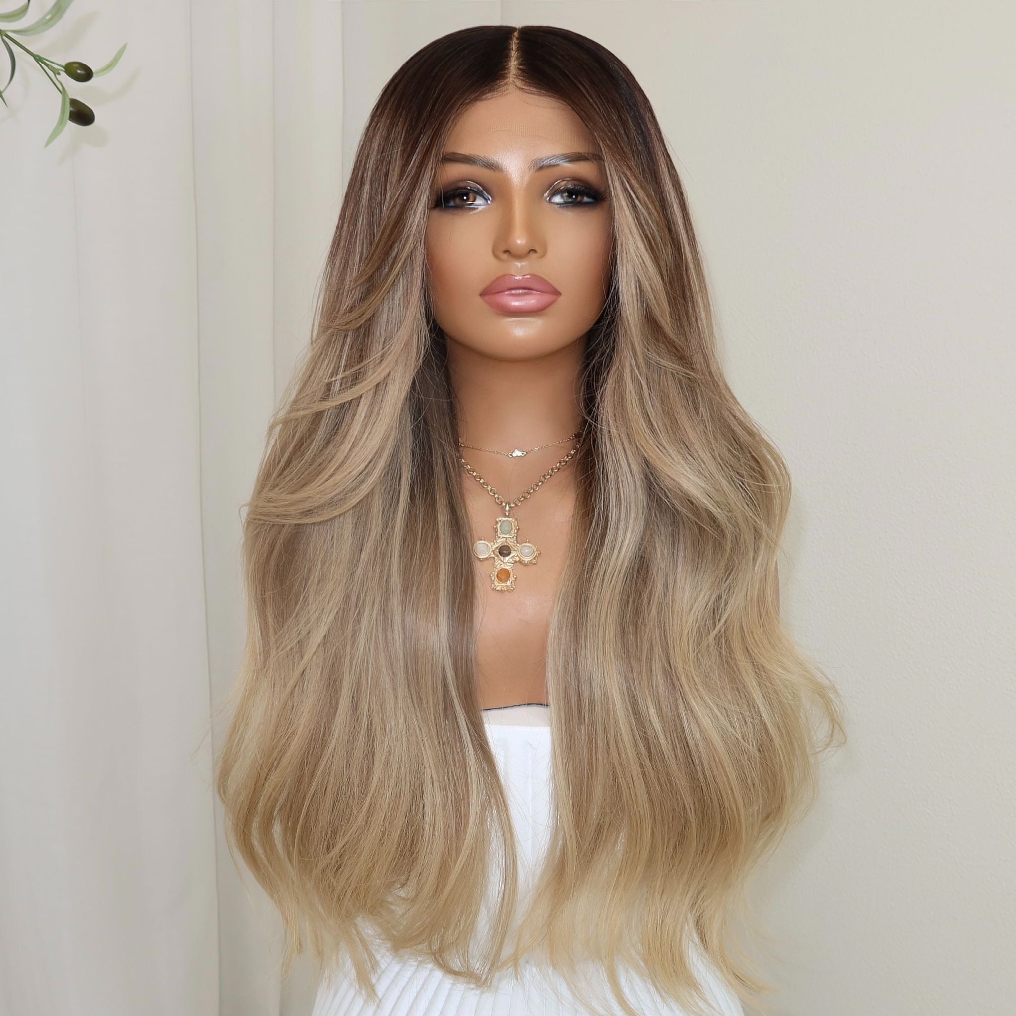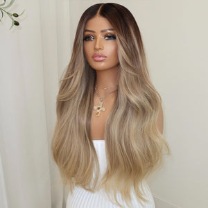 COLOUR: NATURAL BROWN ROOT FADING INTO SOFT GOLDEN BLONDE ENDS AND FACE FRAMING HIGHLIGHTS